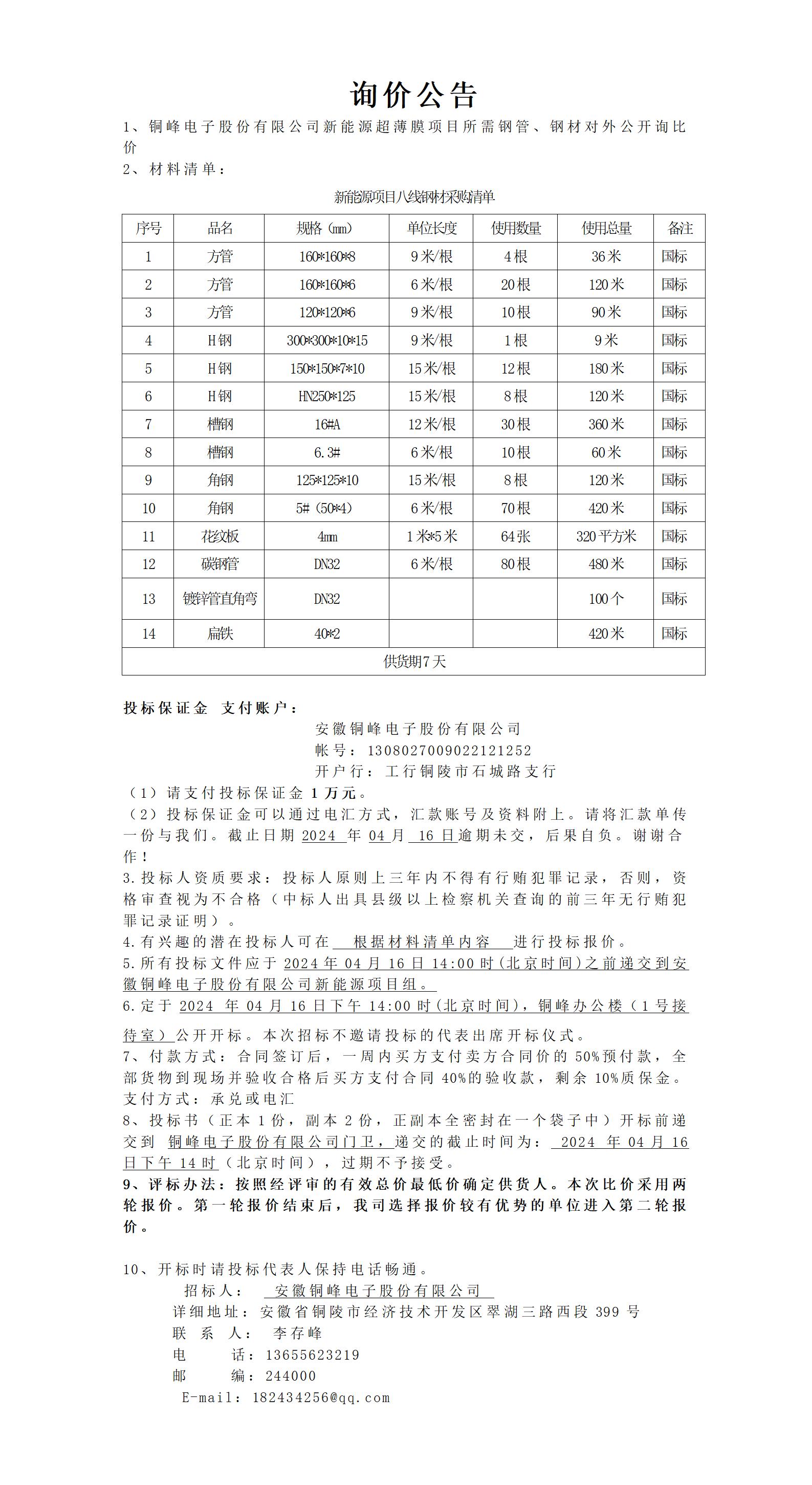 銅峰電子股份有限公司新項(xiàng)目八線鋼材詢價公告