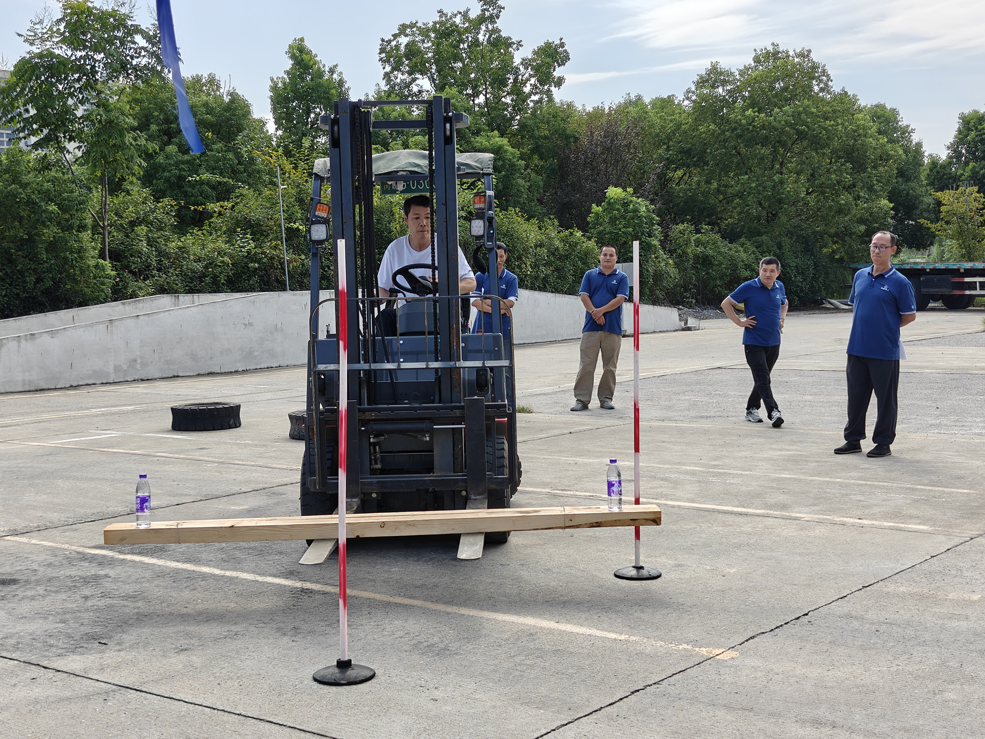 叉車技能比武側重于選手的操控熟練性與心理素質。項目設置緊密貼合實際作業(yè)場景,要求選手在限定時間內完成轉向往返、托盤精準移庫碼放等動作,并在繞障礙物操作過程中確保托盤上礦泉水瓶保持穩(wěn)定,不得掉落。競賽不僅要求速度,更注重操作的平穩(wěn)性與準確性,充分體現(xiàn)出高標準的作業(yè)要求。