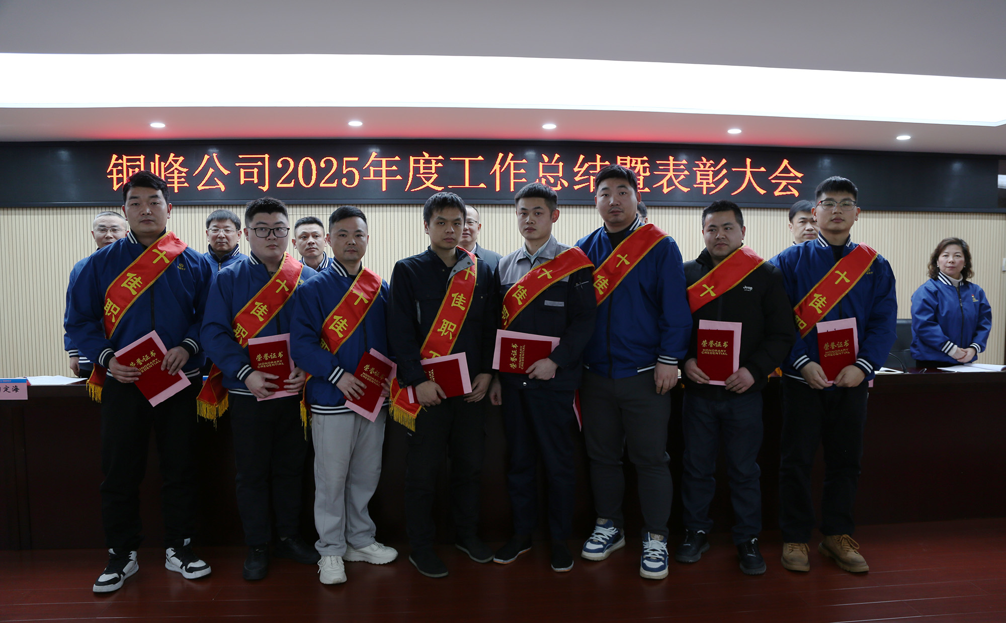 與會領(lǐng)導為受表彰的2025年度公司“十佳職工”頒發(fā)榮譽證書及獎金?!笆崖毠ぁ薄⒔?jīng)營單位和職能部門代表分別作表態(tài)發(fā)言。